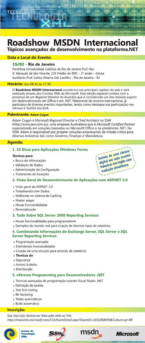 Adam is off travelling again and this time the destination is Brazil and Argentina! Lookout Carnival goers! Adam will be presenting varies topics to the .NET development community in a number of cities. His sessions cover tips for WinForm applications, Reporting Services, Whidbey, extreme programming. View poster.