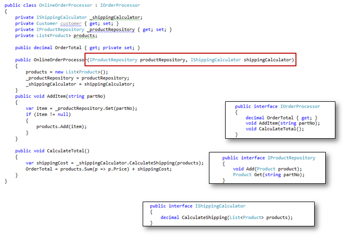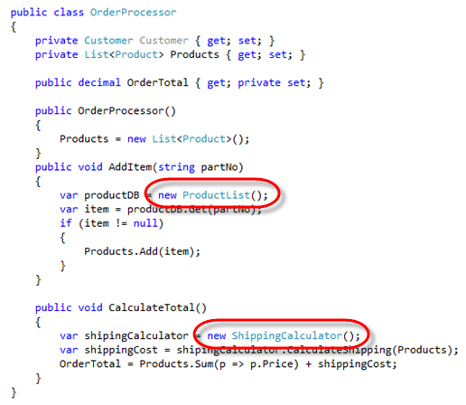Figure: Good Example – The dependencies are injected into the class. This enables alternative classes to be injected. For example, a DHLShippingCalculator should be easily substituted for a FedexShippingCalculator. A MockShippingCalculator and MockProductRepository could be injected if we wanted to run unit tests