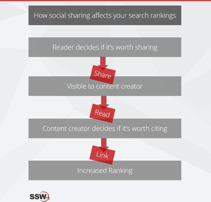 While social media doesn’t directly affect your Google ranking, social sharing does directly increase the visibility of your page. That increased visibility means it may get noticed by a creator of content, such as a blogger, journalist, or an author. That creator may mention it in a subsequent piece of content and if they linked to it, that page is then more likely to rank well.