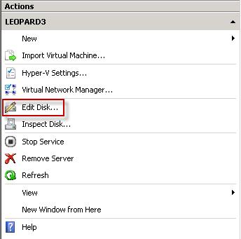 ** Figure: You expand a VHD from the Actions Menu | Edit DiskYou will now have a resized VHD. Next step is to boot up into the virtual machine and tell disk manager to resize the partition on the VHD to use the free space which has been added at the end of the VHD. Windows Server 2008 makes this very simple: