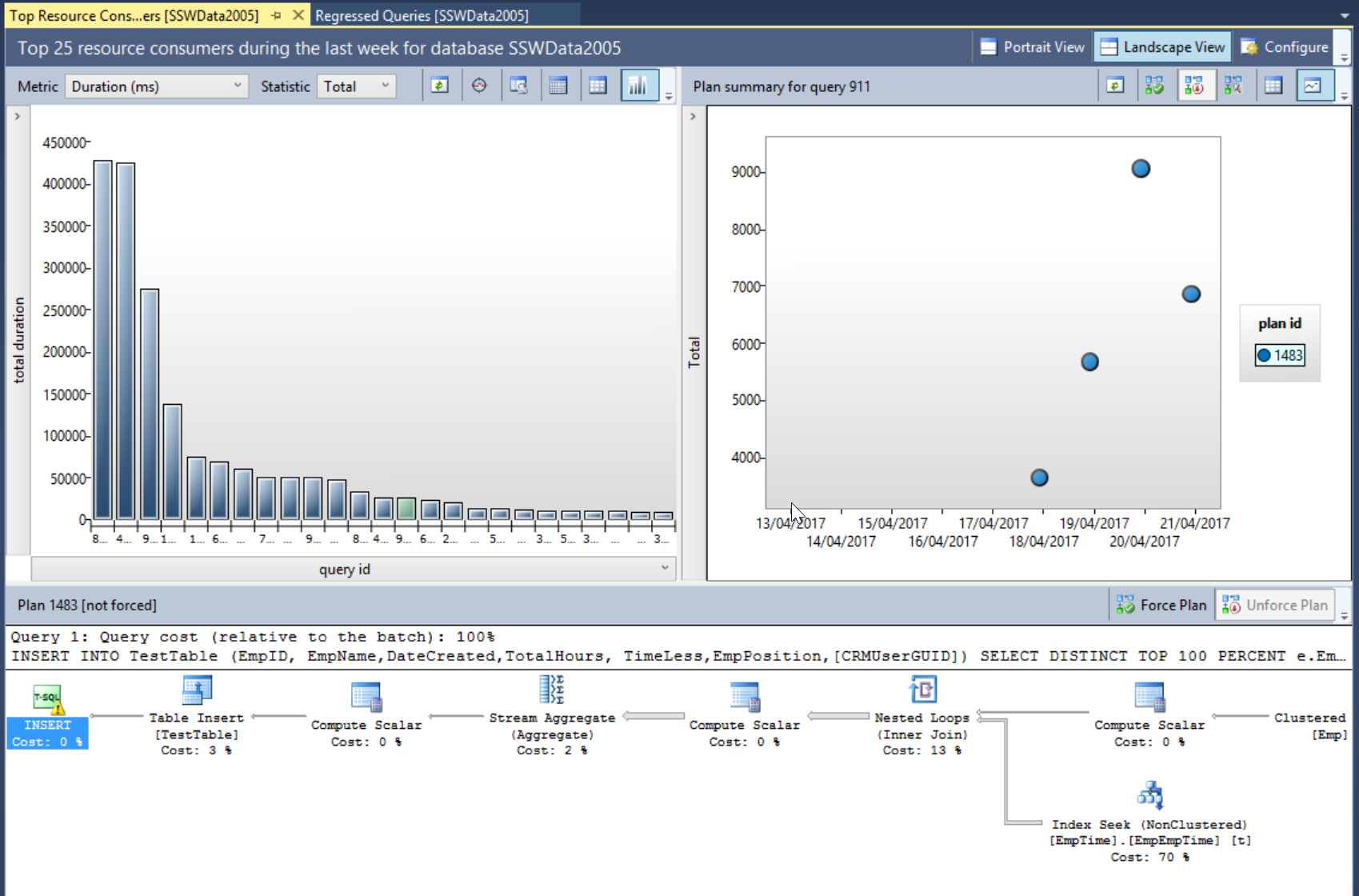 As with the Regressed Queries tab, the query plan history and details of a particular query plan are available for inspection. This provides all the required information to track down the part of the application that is calling the poorly performing SQL, and also provides insight into how to fix the poor performance depending on which SQL step is taking the most time.