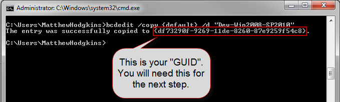 Figure - Creating the entry using BCDEdit shows your GUID 4. Type:
