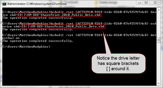 bcdedit /set <GUID> osdevice vhd=[D:]\VM-DEV-SharePoint_2010_Public_Beta.vhd