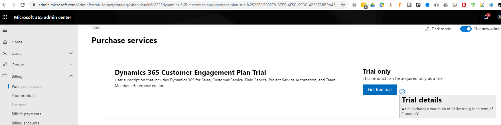 The second option is to provide a trial via Office 365. If using this method, it is preferable to provision via the client's Office 365 instance, as you don't want to provision users for the client in your Office 365 tenant. To provision a Dynamics trial in Office 365 use the following:
