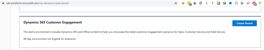 Adding a Dynamics Environment is as easy as navigating to: My Environments | Create Tennant | Dynamics 365 Customer Engagement
