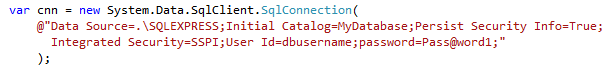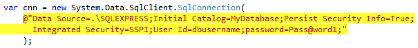 Figure: Bad Example - The connection string is hard-coded and isn't easy to see in the IDE.