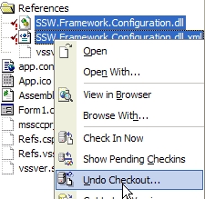 Figure: Undo Checkout, when VS.NET checked them out for you...All done. In the future, whenever you do get-latest?on the project, the any updated dlls should come down and be linked the next time you compile. Also, if anyone checks out your project from Source Safe, they will have the project linked and ready to go.