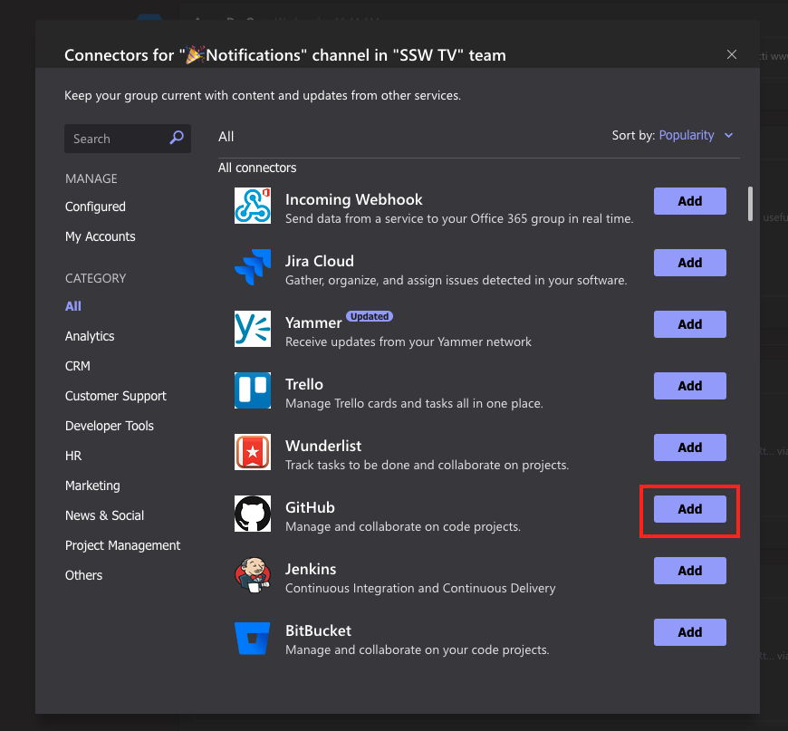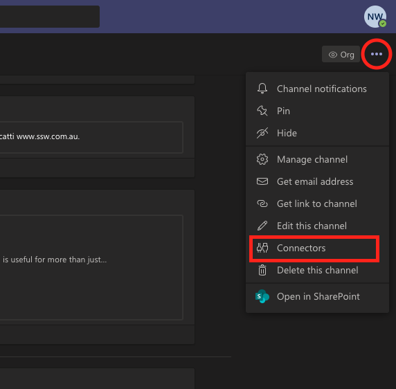 A majority of these notifications can be created using the connectors that are built into Teams. To create a connection: