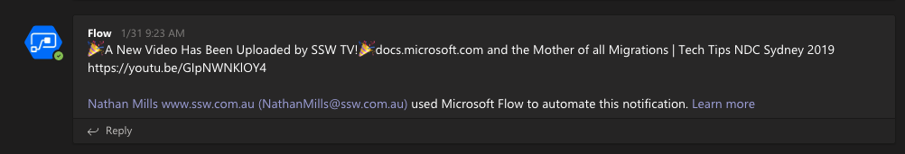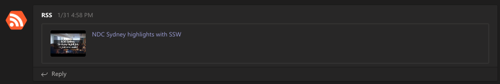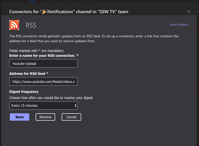 Figure: The configuration page for the RSS Connector that notifies of a new video being uploaded to the SSW TV Youtube channel with a name that describes what it does.