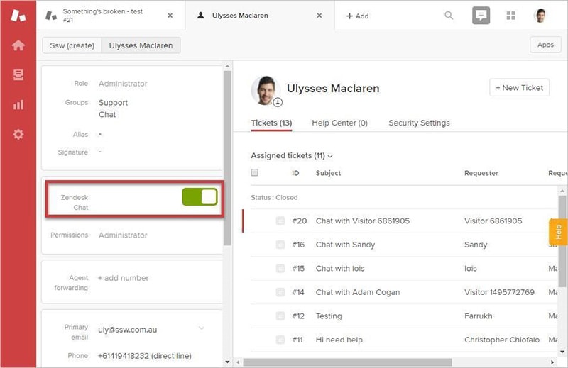 Zendesk support agents can have chat enabled, allowing them to answer chats from the website.