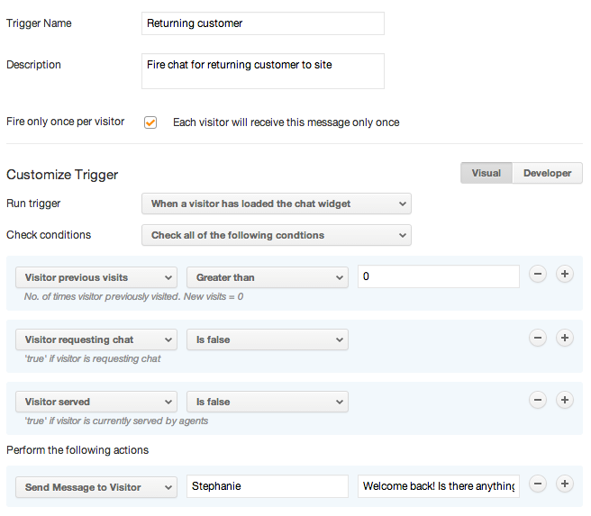 Repeat customers and return web visitors are valuable to your business. To help make sure these customers are finding what they need, you can proactively reach out to them via chat to welcome them back and see if there is anything you can provide guidance with.