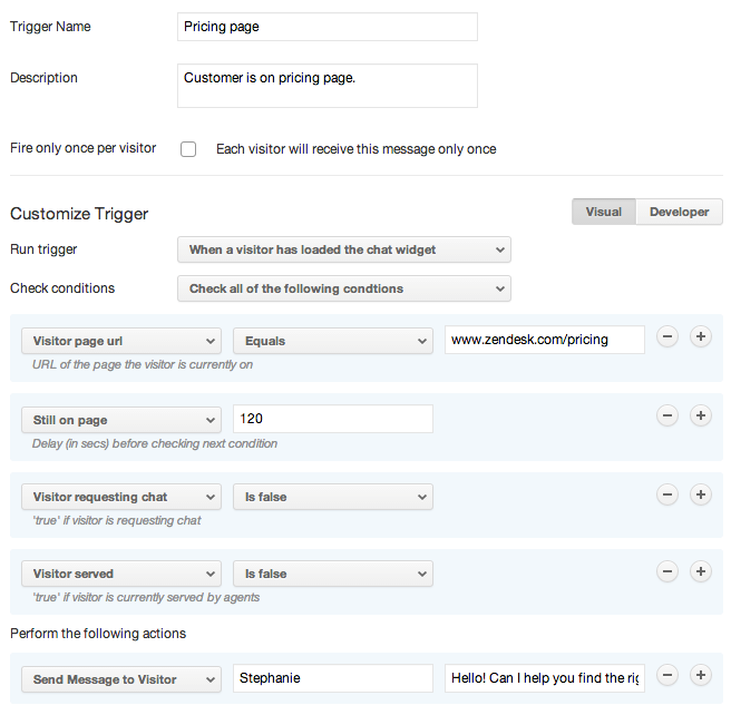 In some cases, you might want to reach out to your customer via chat before they have to reach out to you. You can set up Zendesk Chat triggers that initiate a proactive chat with a customer based on specified conditions that you define. Your customer can choose whether or not to respond.