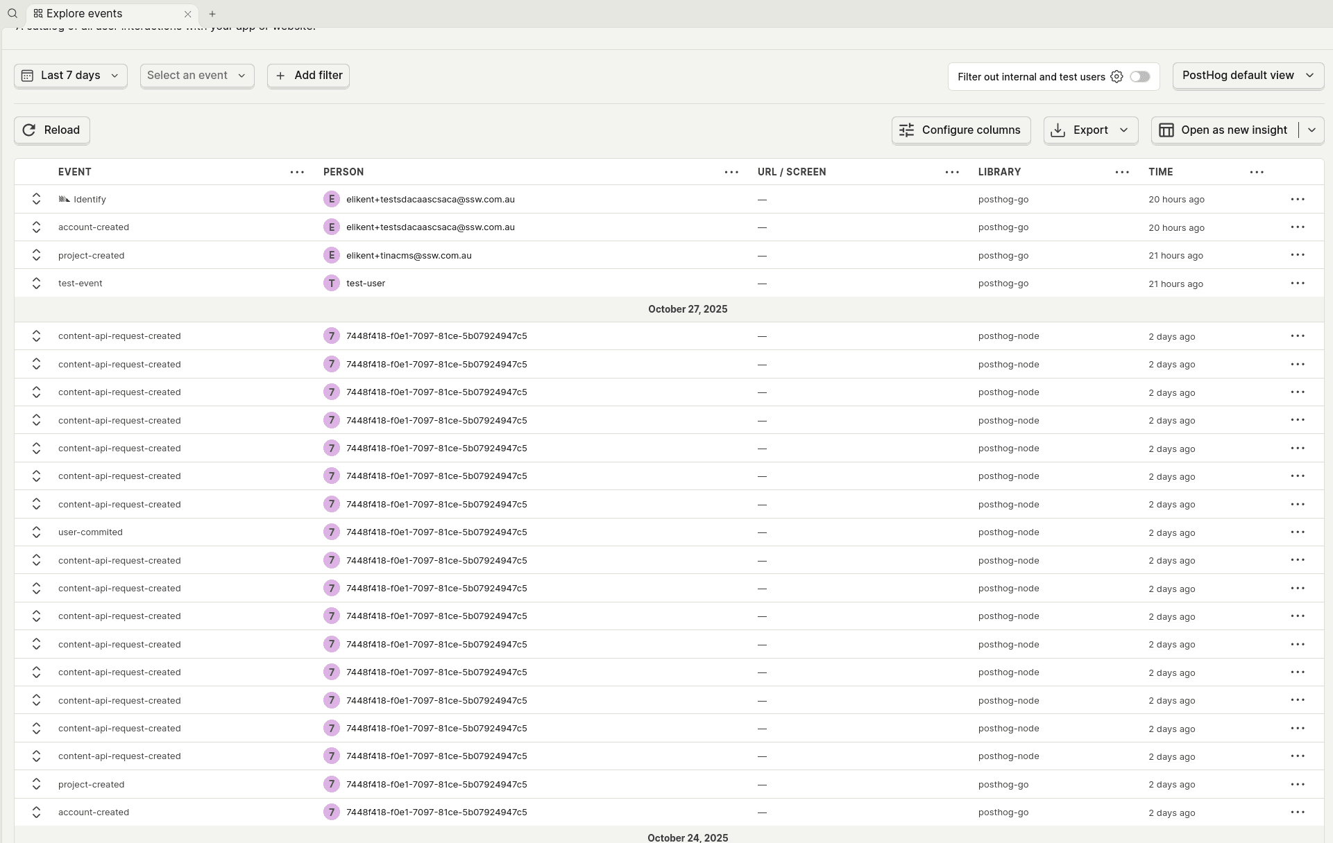 Figure: PostHog dashboard showing key metrics at a glance PostHog excels at answering questions like "Which features are users actually using?" and "Where do users drop off in our workflow?" The session replay feature is particularly valuable for debugging user-reported issues, while exception reporting ensures you're notified immediately when errors occur