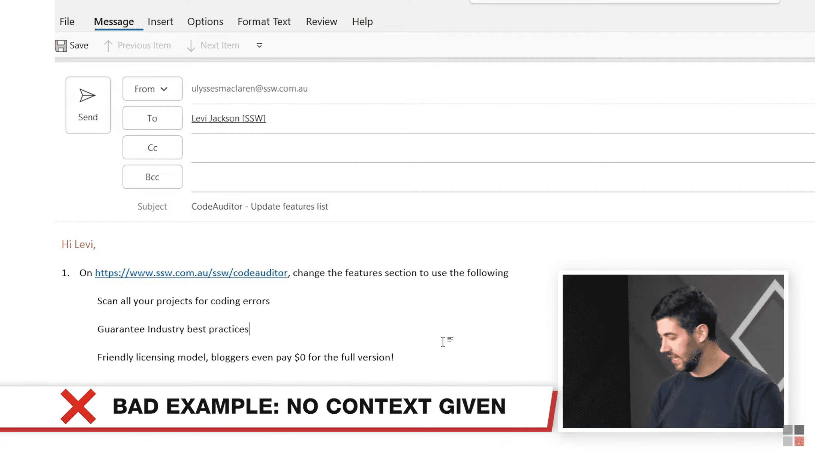 - Briefly introduce yourself. E.g. "I'm David, Solution Architect at SSW"