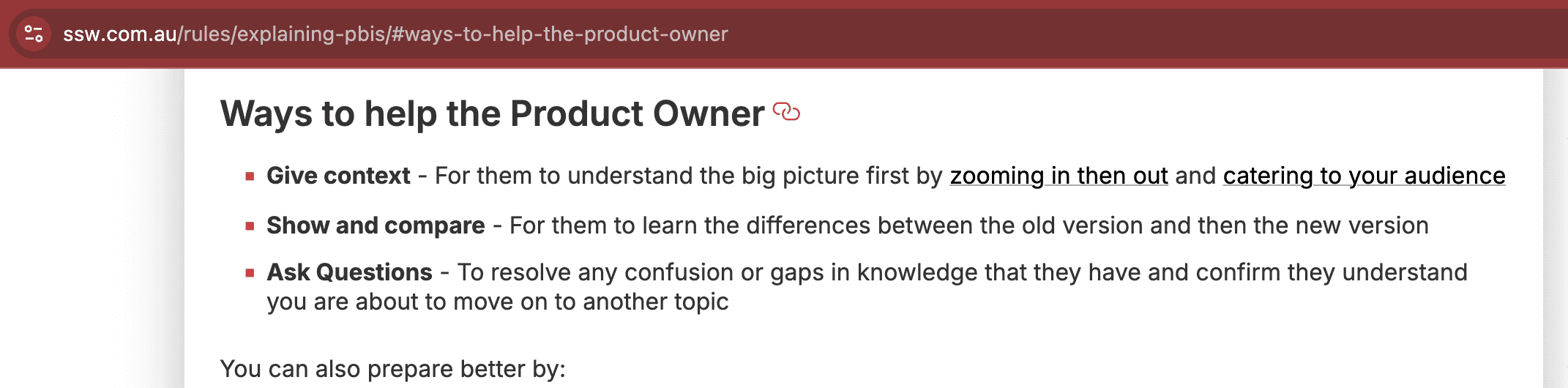 As an example, the SSW website follows a consistent order: a summary of the product/service and its benefit, followed by a link for more information on that topic.