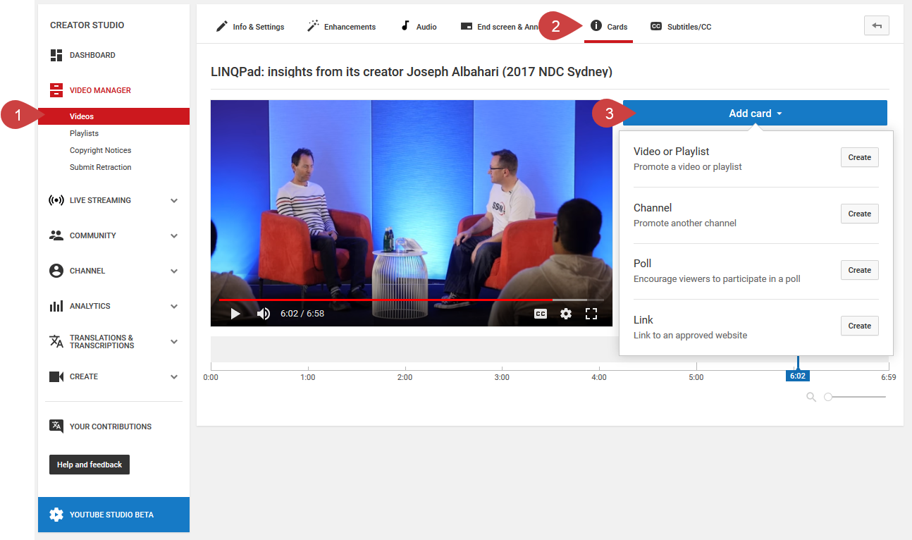 Cards are like dynamic notifications in the top right corner of your video and you can choose the exact moment it should pop up. Cards can include images, outside links (try to avoid those) and even content that is downloaded when viewers click (an eBook for instance). You can add up to five cards per video and each card can: